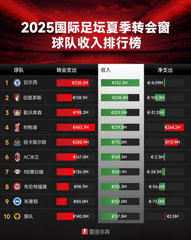 2025夏窗收入榜:切尔西3.3亿领衔,樱桃、药厂紧随其后