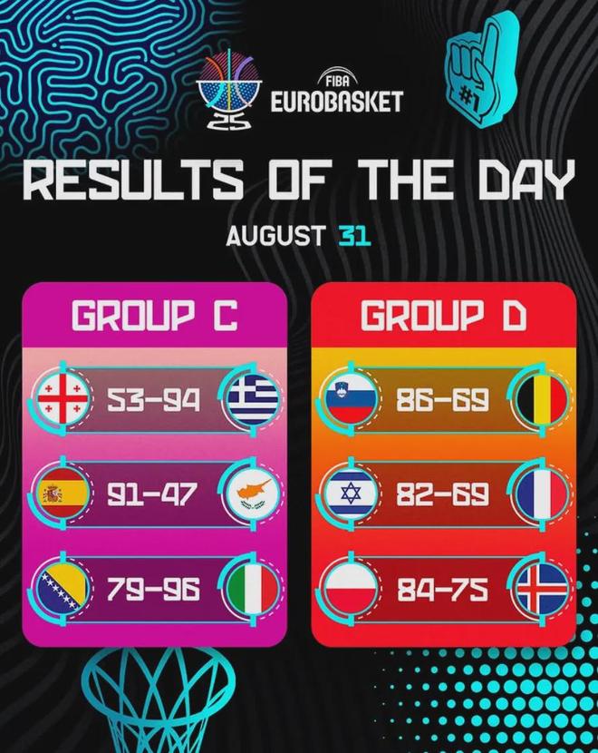 继续来讲欧锦赛,今天凌晨又是6场小组赛,先看综述。格鲁吉亚53比94希腊,西班牙91比47塞浦路斯,波斯尼亚79比96意大利,斯洛文尼亚86比69比利时,以色列82比69法国,波兰84比75冰岛。目