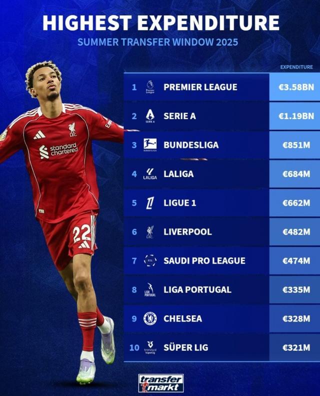 直播吧9月2日讯 今夏主流联赛转会窗已经关闭,《转会市场》也统计了各大联赛的支出情况,值得一提的是利物浦和切尔西作为单一球队也被列入排名。2025夏季转会窗各联赛支出支出