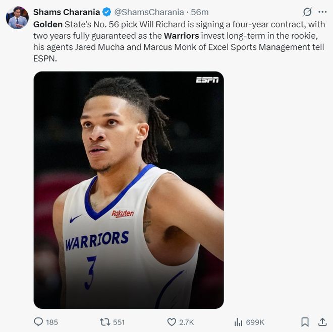 紧接着ESPN透露,勇士队与今年56号秀威尔-理查德签下了一份新秀四年合同,这份合同前两年是全额保障,后面两年是不保障+球队选项。(另一位新秀52顺位的图希还没有跟球队签约)