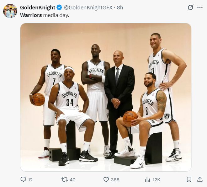 勇士媒体晒出一张极具讽刺的图,那就是当年布鲁克林篮网的养老大队:皮尔斯、乔约翰逊、加内特、德隆威廉姆斯、大洛、基德,然后写道:这就是勇士队的媒体日。(暗示勇士队就是当年的篮网养老大队)